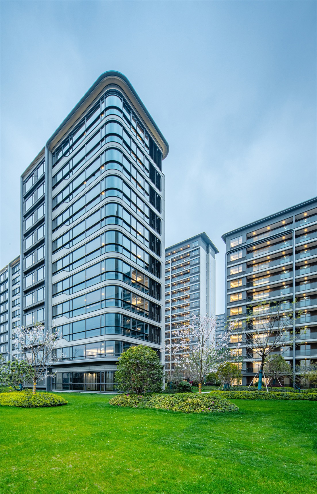 純現(xiàn)代材料語言,玻璃與鋁合金的搭配,賦予建筑現(xiàn)代而亮麗的特質(zhì)。舒展的線條穿插與材質(zhì)的高品質(zhì)細節(jié)結(jié)合,體現(xiàn)未來城市的面貌。頂部局部弧線收頭,暗示時尚及運動氣質(zhì),總體舒朗簡潔又不失優(yōu)雅。