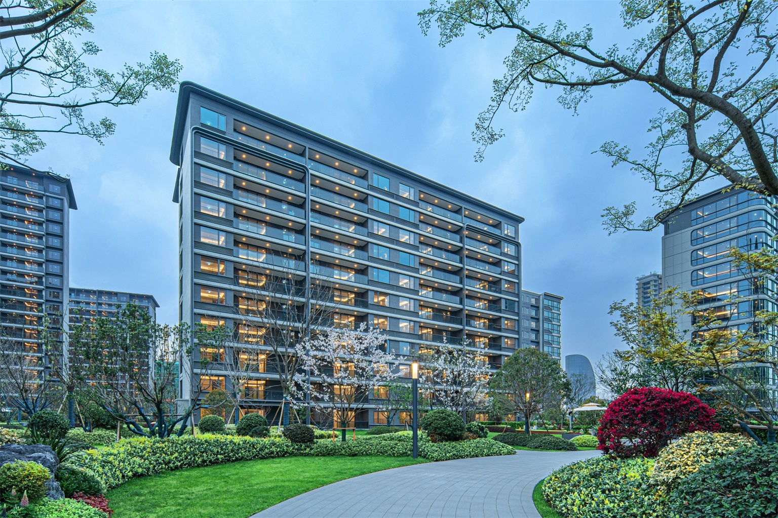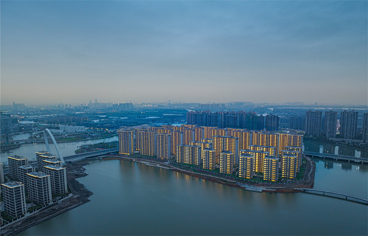 規(guī)劃設(shè)計既蘊含了古典美學(xué)的中軸格局,又有現(xiàn)代都市的活躍與動感。每幢樓宇間均能感受空間的層級劃分,由路向湖遞減的體量變化,體現(xiàn)了城市向自然與藝術(shù)的過渡轉(zhuǎn)變。